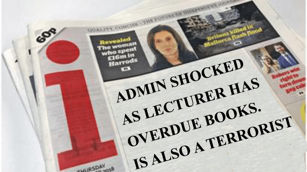 In my 2nd year of college, I discovered that one of my lecturers had a series of overdue library books from the college library. Being a man of moral integrity and an officer of justice, I did what any citizen would do and called in a bomb threat on his house. This combined with the explosives I planted in his office gave me a great article in the college newspaper the next day.