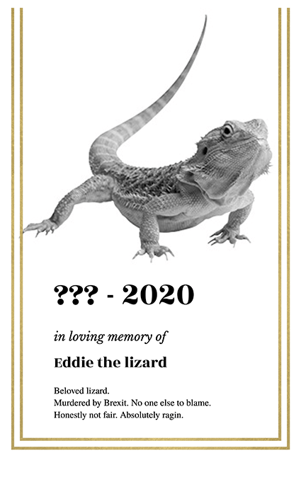 While this is all well and good, no intriguing article or fascinating debate will bring my pet lizard Eddie back to life. Unfortunately, that is a bell that cannot be un-rung. And I will not rest until it is acknowledged that Brexit is guilty of the killing- nay murdering of my poor innocent pet lizard.